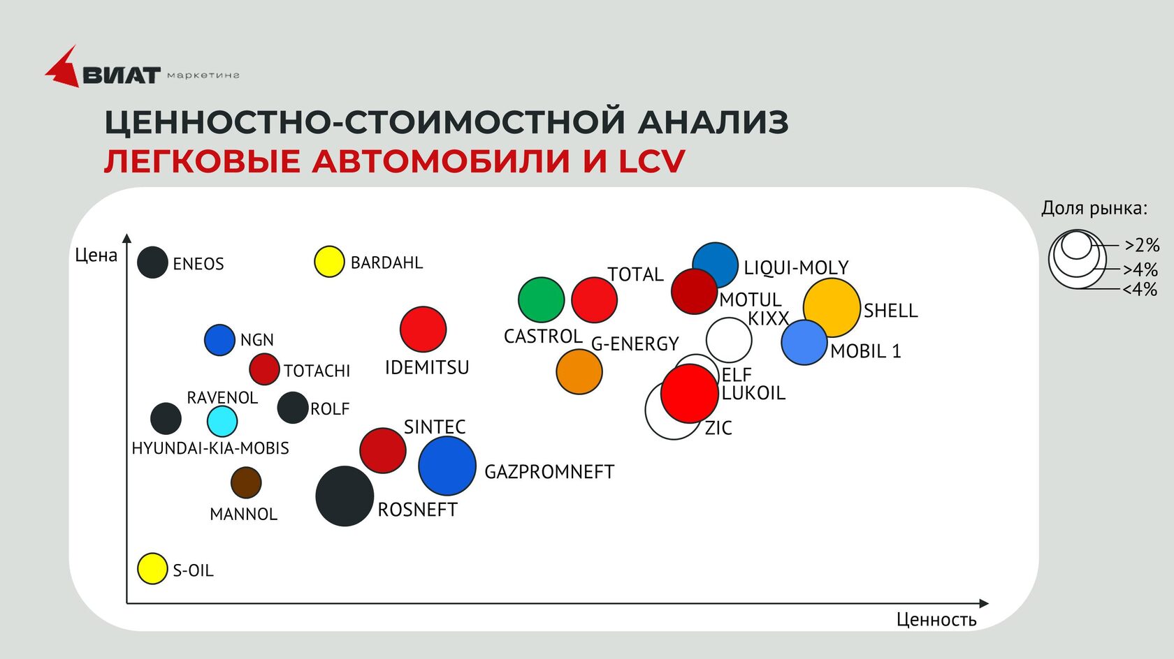 Например, один из производителей премиального моторного в погоне за ценами на контрафактные масла Shell, снизил за два года стоимость своей продукции на 30%, не сформировав достаточного объёма лояльной аудитории. Такое позиционирование мы считаем провальным, так как продукт так и не смог донести достаточный уровень ценности до клиентов. Рекомендую вам изучить ценностно-стоимостной анализ, который мы провели для клиента, и написать ваше мнение о том, в чём была ключевая ошибка производителя: