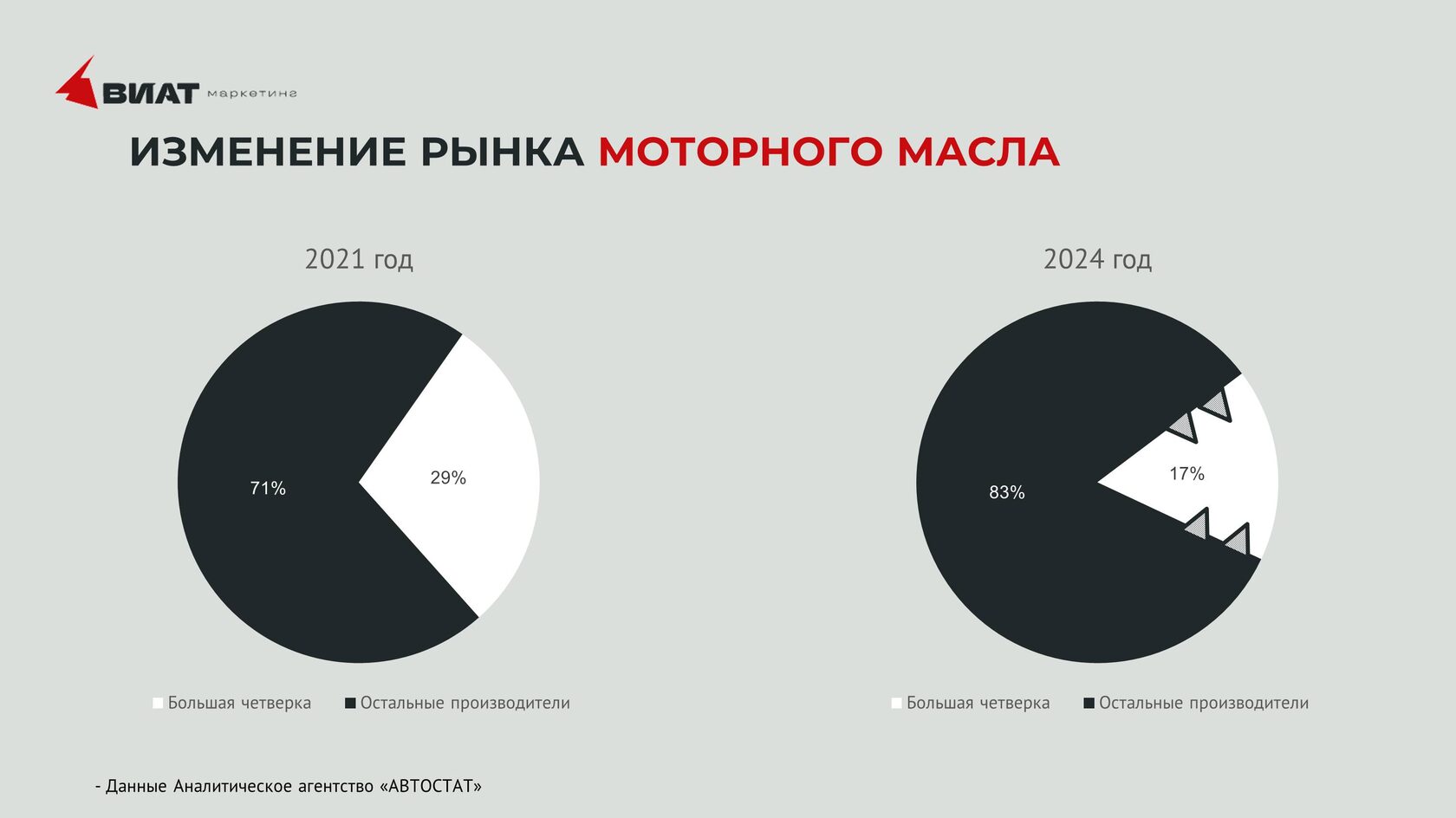 В 2022 году с Российского рынка уходят четыре ключевых игрока: Shell, Mobil, Castrol, TotalEnergies (бренд Elf, Total) которые занимали 29%. Продукция данных производителей продолжает поставляться дистрибьюторами по параллельному импорту, но и за отсутствия управления развитием брендов и наплыва “контрафакта” доля “большой четвёрки” активно сокращается. Для тех, кто остался — открываются новые возможности для роста.