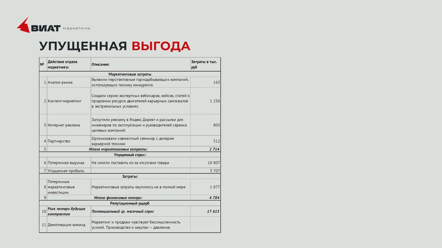 Рассмотрим на примере. В компании, занимающейся импортом моторных масел, маркетинговый отдел работает над увеличением продаж продукции для карьерной техники. Проводится анализ рынка, выявляются перспективные компании. Готовится серия экспертных вебинаров, кейсов и статей. Запускается контекстная реклама и рассылки. Организован совместный семинар с дилером карьерной техники. Отдел маркетинга увеличивает количество входящих запросов на поставку масла на 44%. Однако отдел закупок не смог организовать поставку дополнительного объёма продукции — склад пожаловался на нехватку мест для хранения. Отдел продаж, в свою очередь, не смог удовлетворить запросы клиентов и столкнулся с негативом с их стороны. Итог: компания упустила прибыль в размере 3,7 млн руб.