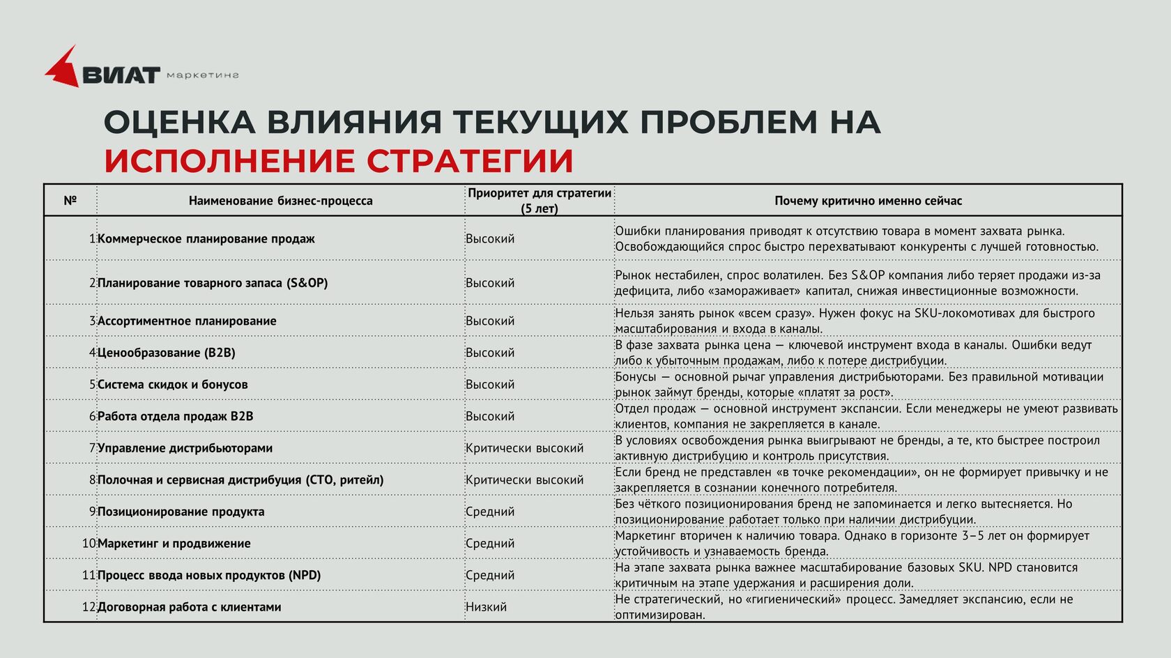Следующим шагом становится оценка влияния текущих проблем на исполнение стратегии компании. Выявив проблемы, компания не может в одно мгновение прийти в идеальное состояние. Любые изменения предшествуют трансформации, в процессе которой мы можем столкнуться с дополнительными сложностями, например, нехватке ресурсов, неготовности команды меняться, сопротивление партнёров и т.д. Чаще руководители компаний, работая с таким списком, начинают изменения с самых простых проблем, которые могут принести не самые большие, но быстрые результаты. Наша задача заключается в том, чтобы показать, какие изменения необходимы компании для эффективного развития на ближайшие 5-10 лет.