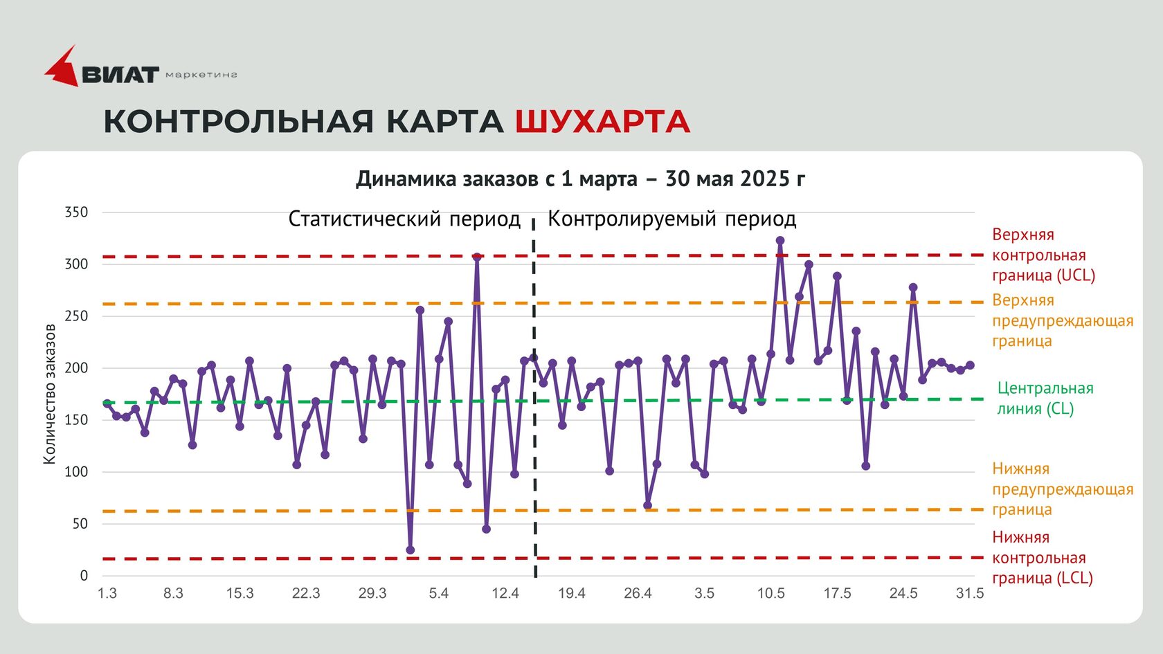 Для снижения "шума" в оценке рекламы мы реорганизовали бизнес-процесс, добавив в него контрольные карты Шухарта. Этот инструмент, созданный Уолтером Шухартом в 1924 году, фокусируется на фильтрации несистемных отклонений, что повышает достоверность данных для внесения изменений.